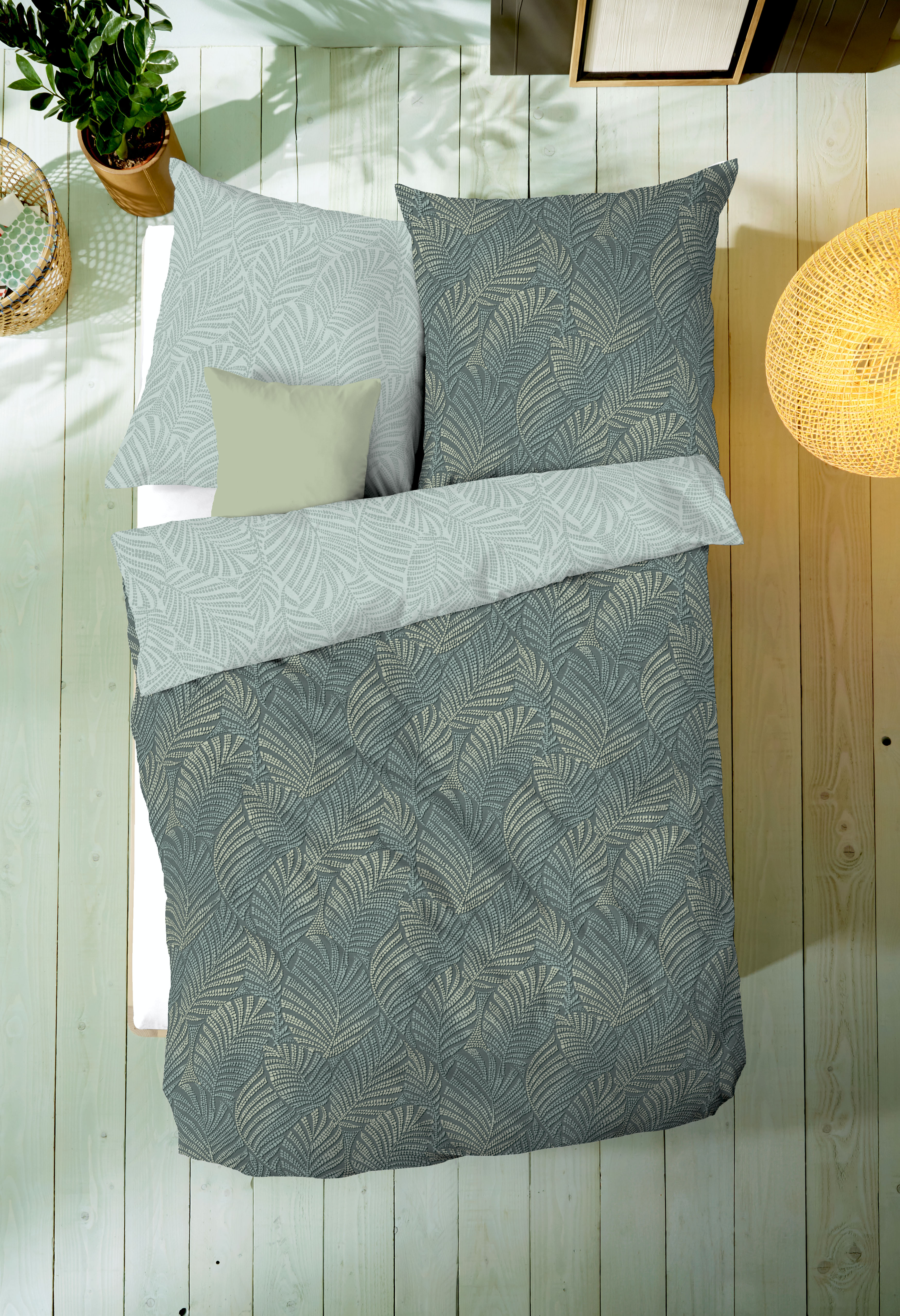 Produktinformationen "Mako Satin Bettwäsche mit Blätter-Muster in Mint-Grün"